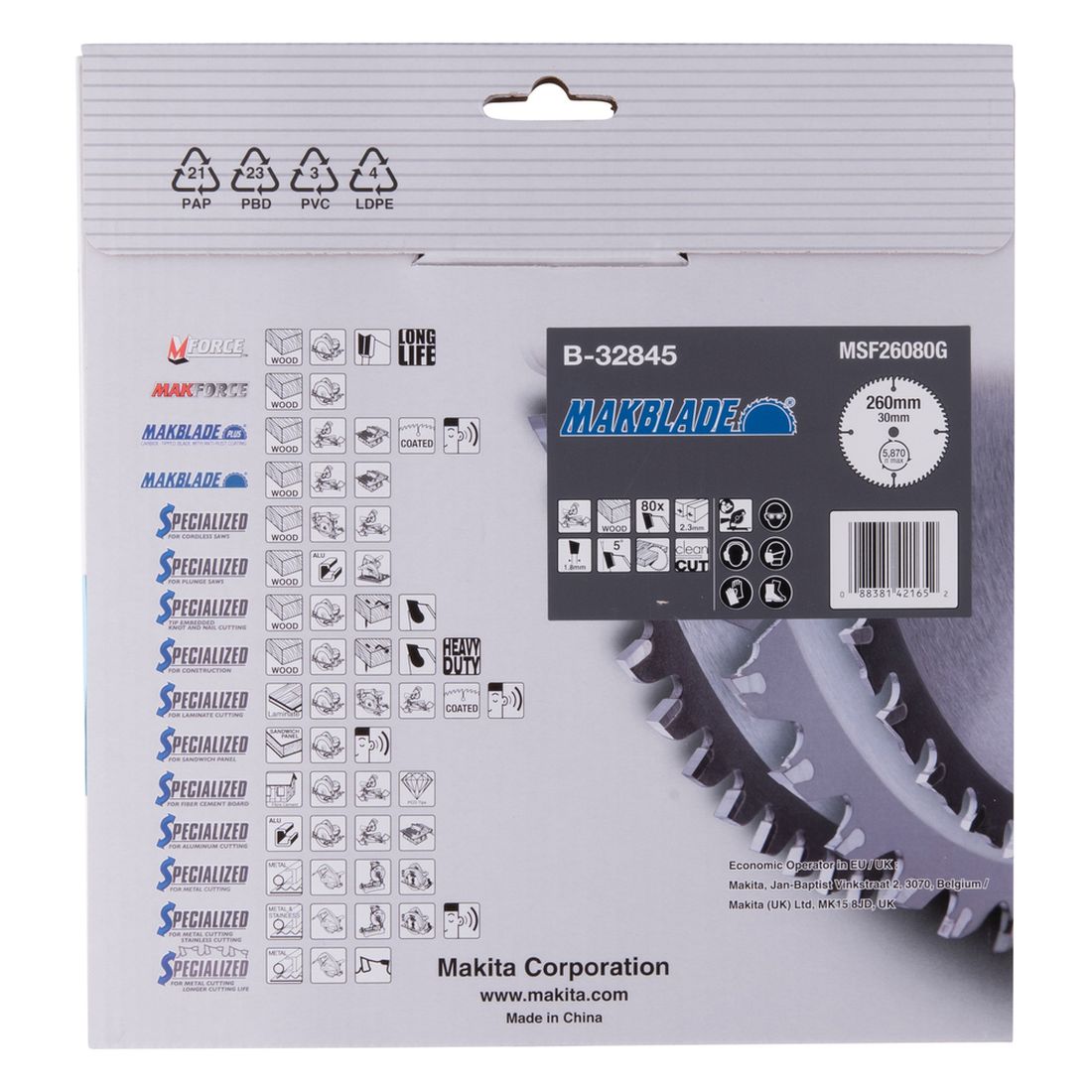 Makblade pyörösahanterä 260 mm halkaisijalla ja Z80 hammastuksella puun sahaamiseen. Terä jättää erittäin siistin sahausjäljen ja soveltuu pöytä sekä jiirisahoilla käytettäväksi. Terän hampaan leveys 2,3 mm ja reiän halkaisija 30 mm.